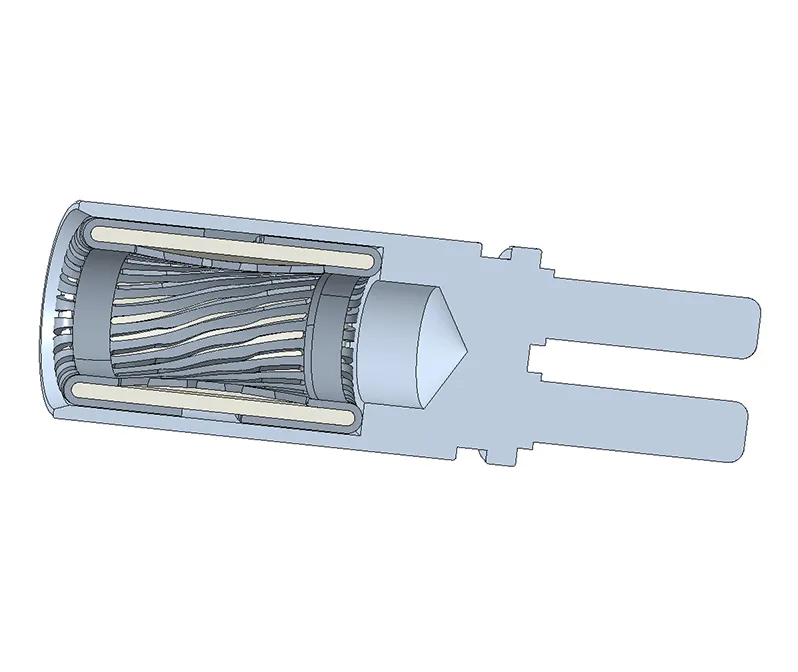 复合接触机制:采用反爪扭簧(提供弹性压力)与双插针(多点接触)组合,实现面接触与线接触双重路径,有效减小接触电阻并增强振动稳定性。